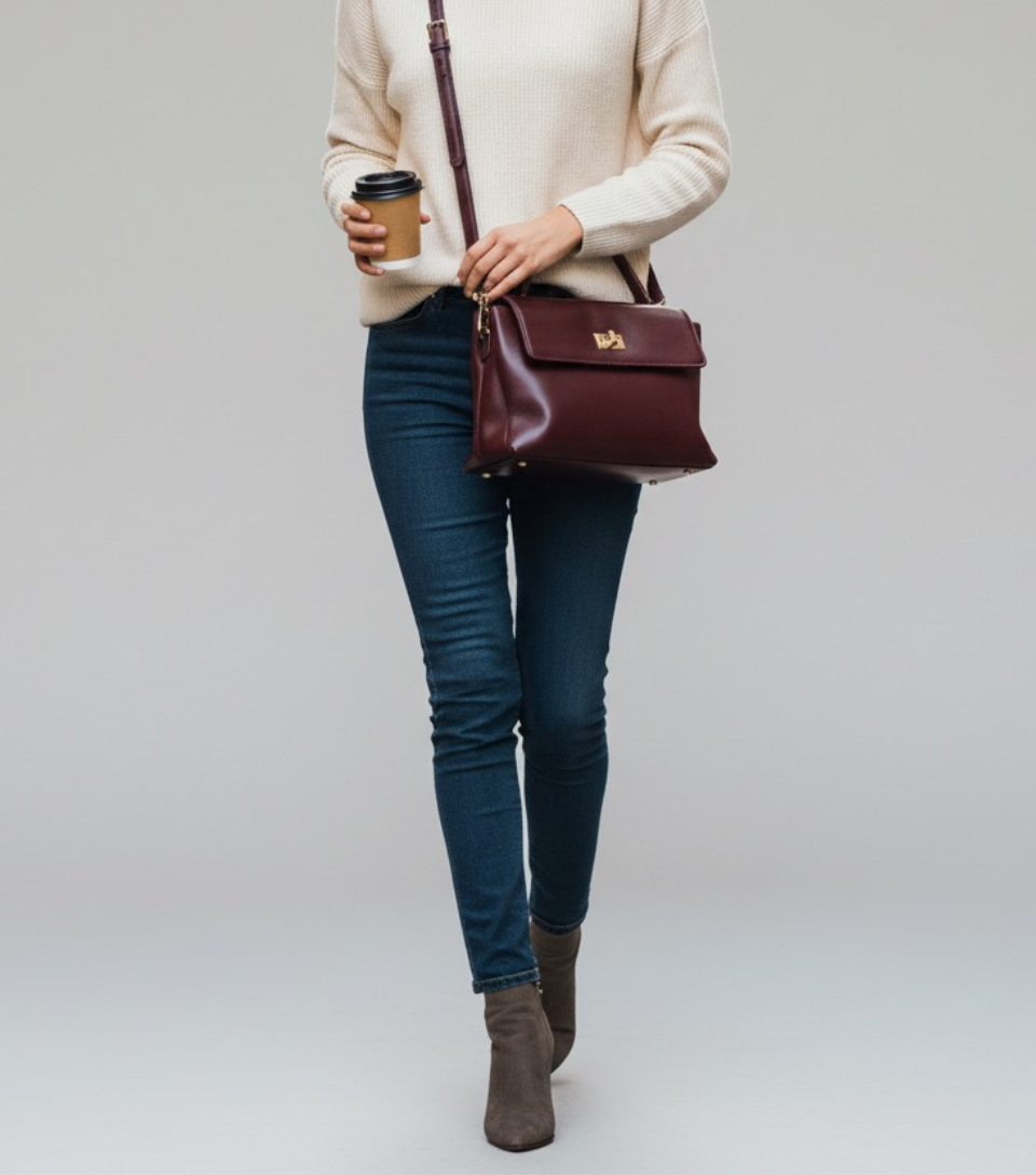 Le Sac Élégance est un accessoire structuré, conçu pour allier sophistication et usage quotidien. Réalisé en cuir de vache lisse bordeaux, il est sélectionné pour son design épuré et sa finition soignée, idéal pour toutes les occasions.